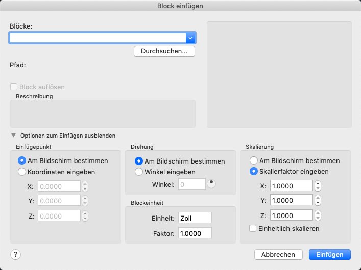 Erweitert oder reduziert den Abschnitt Optionen zum Einfügen, in dem Sie den Einfügepunkt, die Drehung und die Skalierung für die zu erstellende Blockreferenz angeben können.