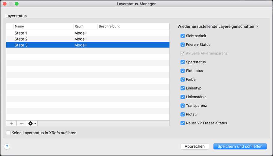 Zeigt eine Liste der in der Zeichnung gespeicherten Layerstatus an. Sie können Layerstatus erstellen, umbenennen, bearbeiten und löschen.