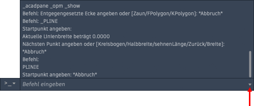 Sie können das erweiterte Befehlsprotokoll auch anzeigen, ohne ein eigenes Fenster zu öffnen. Drücken Sie F2 oder verwenden Sie das Steuerelement am rechten Ende der Befehlszeile, zum Anzeigen des erweiterten Befehlsprotokolls.