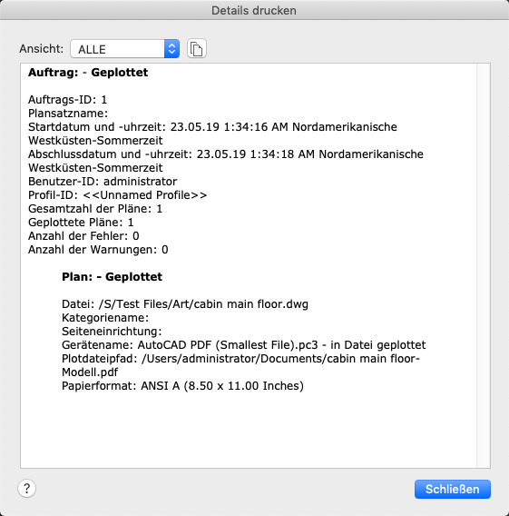 Zeigt Informationen zu Plot- und Publizieraufträgen an, die in der aktuellen Sitzung abgeschlossen wurden.
