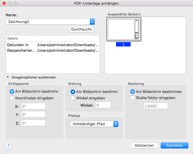 Erweitert oder reduziert den Abschnitt Optionen zur Materialzuweisung, in dem Sie den Einfügepunkt, die Drehung und die Skalierung für die anzuhängende PDF-Unterlage angeben können.
