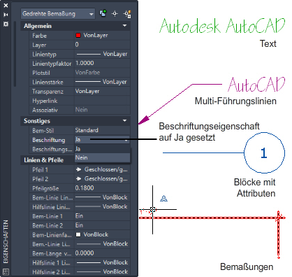 Beschriftungsobjekte umfassen Bemaßungen, Anmerkungen und andere Arten von beschreibenden Symbolen oder Objekten, die häufig dazu dienen, Zeichnungen Informationen hinzuzufügen.