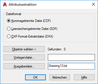 Legt das Dateiformat für die Attributinformationen fest, bestimmt die Objekte, aus denen die Informationen extrahiert werden sollen, und gibt den Namen der Schablone und der Ausgabedatei für die Daten an.