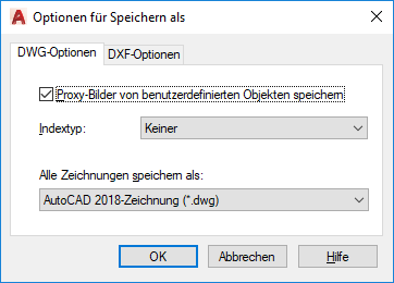 Wenn Sie ein älteres Format zum Speichern auswählen oder die Zeichnung benutzerdefinierte Objekte aus einer anderen Anwendung enthält, können Sie die Option Proxy-Bilder von benutzerdefinierten Objekten speichern wählen, um die Bilder der benutzerdefinierten Objekte in der Zeichnungsdatei zu speichern. (Systemvariable PROXYGRAPHICS)