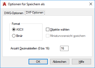 DXF-Optionen, Registerkarte, Dialogfeld Optionen für Speichern als