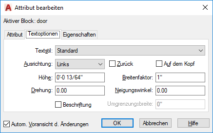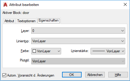 Bestimmt die Eigenschaften, die festlegen, wie ein Attributtext in der Zeichnung angezeigt wird. Die Farbe des Attributtextes können Sie auf der Registerkarte Eigenschaften ändern.