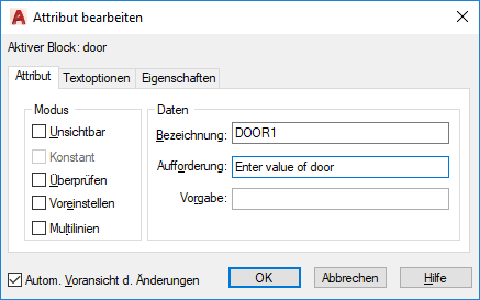 Definiert, wie einem Attribut ein Wert zugewiesen wird und ob der zugewiesene Wert im Zeichnungsbereich sichtbar ist. Außerdem wird hier die Zeichenfolge festgelegt, die den Benutzer zur Eingabe eines Wertes auffordert. Die Registerkarte Attribut zeigt außerdem die Bezeichnung an, die das Attribut kennzeichnet.