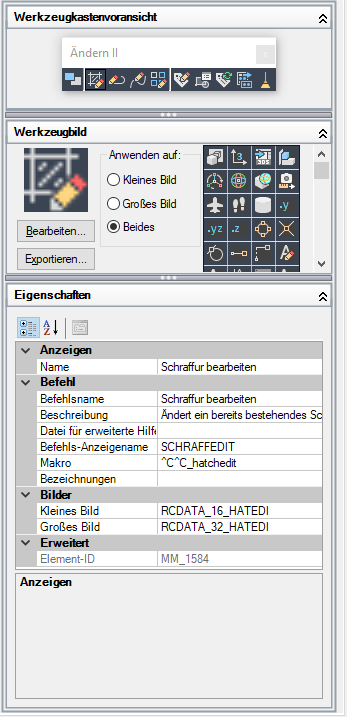 Mit dem CUI-Editor können Sie viele Elemente der Benutzeroberfläche ändern, die zum Starten eines Befehls im Programm verwendet werden.