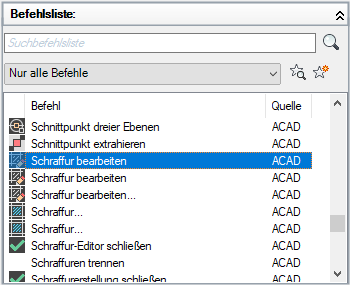 Oben im Bereich Befehlsliste befindet sich das Feld Suchbefehlsliste, mit dem Sie die Befehlsliste basierend auf einer eingegebenen Textzeichenfolge filtern können. Die Textzeichenfolge wird mit allen Teilen eines Befehlsnamens abgeglichen, woraufhin im Feld Befehlsliste die Ergebnisse angezeigt werden.