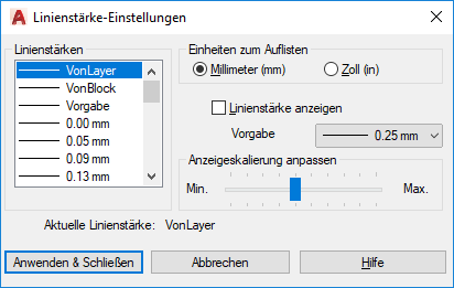 Für die Linienstärken stehen bestimmte Einstellungen zur Verfügung, einschließlich VONLAYER, VONBLOCK und VORGABE. Der Wert für VORGABE wird durch die Systemvariable LWDEFAULT festgelegt, die einen Ausgangswert von 0.01 Zoll oder 0.25 mm hat. Diese Vorgabeeinstellung gilt für alle neu erstellten Layer. Die Linienstärke 0 wird als ein Pixel im Modellbereich dargestellt, beim Plotten wird die dünnste verfügbare Linienstärke des angegebenen Plot-Geräts verwendet.
