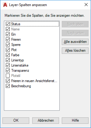 Legt fest, welche Spalten im Layereigenschaften-Manager auf der aktuellen Registerkarte Modell oder Layout angezeigt werden.