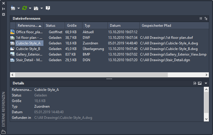 Zeigt eine Liste der Referenzen in der aktuellen Zeichnung an, einschließlich Informationen wie Status, Größe und Erstellungsdatum.