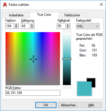 Gibt die Farbeinstellungen mit True Color (24-Bit)-Farben im HSL (Farbton, Sättigung, Helligkeit)- oder RGB (Rot, Grün, Blau)-Farbmodell an. Bei Verwendung der True Color-Funktion stehen über sechzehn Millionen Farben zur Auswahl. Die Optionen auf der Registerkarte True Color sind je nach Auswahl des Farbmodells unterschiedlich.