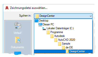 - Navigieren Sie zu dem DesignCenter-Ordner, in dem verschiedene Beispielzeichnungen gespeichert sind.