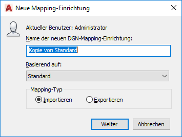 Richtet das Mapping für den Import und Export von DGN-Dateien ein.