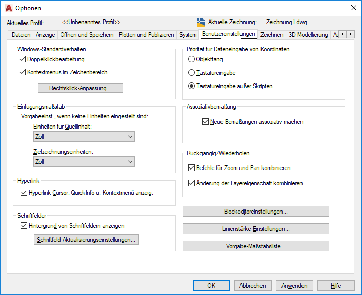 Öffnet das Dialogfeld Rechtsklick-Anpassung. In diesem Dialogfeld werden weitere Definitionen für die Option Kontextmenüs im Zeichenbereich angeboten. (Systemvariable SHORTCUTMENU)
