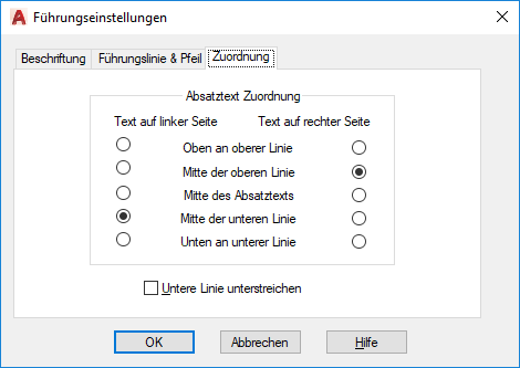 Bestimmt den Punkt, an dem die Führungslinien mit einem mehrzeiligen Maßtext verbunden werden sollen. Diese Registerkarte steht nur zur Verfügung, wenn Sie auf der Registerkarte Maßtext den Maßtexttyp MText ausgewählt haben.