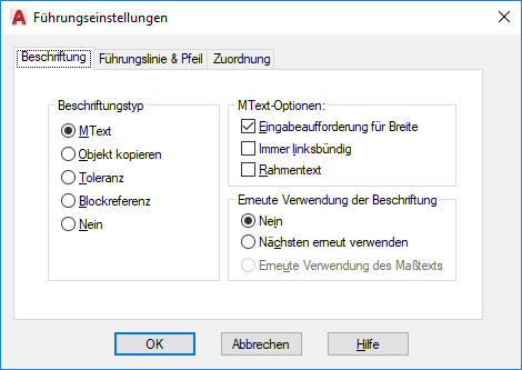 Optionen für die Wiederverwendung von Führungsmaßtext.