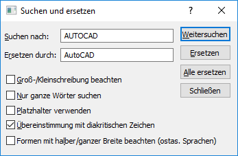 MTEXT (Befehl) Finden: Wählen Sie im Texteditor oder im MTEXT-Kontextmenü Suchen und Ersetzen aus