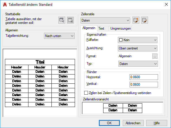 Legt die Texthöhe fest. Die Vorgabetexthöhe für Daten- und Spaltenkopfzellen beträgt 0.1800. Die Vorgabetexthöhe für den Tabellentitel lautet 0.25.
