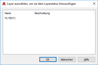 Zeigt den Namen und die Beschreibung der Layer an, die dem Layerstatus nicht hinzugefügt wurden. Wählen Sie den hinzuzufügenden Layer, und klicken Sie auf OK.