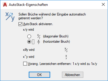 Der Schrägstrich (/) wird in einen horizontalen Bruch konvertiert, wenn AutoStack aktiviert ist.