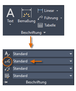 Der Name des aktuellen Bemaßungsstils, in diesem Fall Hitchhiker, wird auch in der Dropdown-Liste der Gruppe Beschriften angezeigt.