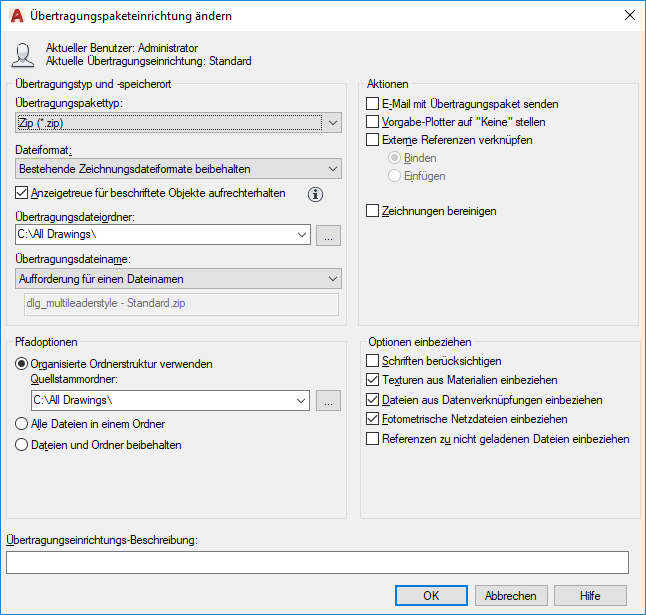 Wenn Sie dieses Feld nicht ausfüllen, wird die Übertragungsdatei in dem Ordner erstellt, der die erste angegebene Zeichnungsdatei enthält. In einem Plansatzkontext wird die Übertragungsdatei in dem Ordner angelegt, der die Plansatzdatendatei (DST) enthält. (Gilt nicht für AutoCAD LT)