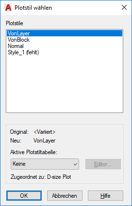 Zeigt die verfügbaren Plotstile an, einschließlich des Standardplotstils NORMAL. Ein Plotstil besteht aus einer Sammlung von Eigenschaften, die beim Plotten angewendet werden.