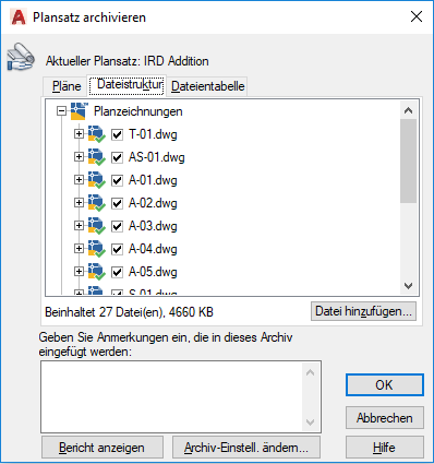 Enthält eine Liste der Pläne, die dem Archivpaket hinzugefügt werden. Die Reihenfolge entspricht der Reihenfolge der Pläne oder der Organisation des untergeordneten Satzes. Dazu muss ein Plansatz im Manager für Planungsunterlagen geöffnet sein. Sie können entweder die Archiv-Option aus dem Kontextmenü wählen, das Sie durch Rechtsklick auf den obersten Plansatzknoten öffnen, oder in der Befehlszeile ARCHIV eingeben.