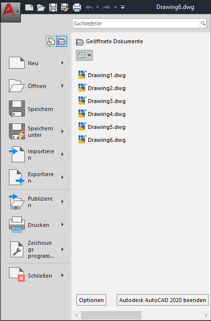Geöffnete Dokumenten werden in der Liste Geöffnete Dokumente mit der zuletzt geöffneten Datei an erster Stelle angezeigt. Wählen Sie einen Dokumentnamen aus, um ihn zu aktivieren.