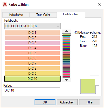Diese Liste enthält sämtliche Farbbücher, die sich an den im Dialogfeld Optionen auf der Registerkarte Dateien angegebenen Speicherorten befinden.