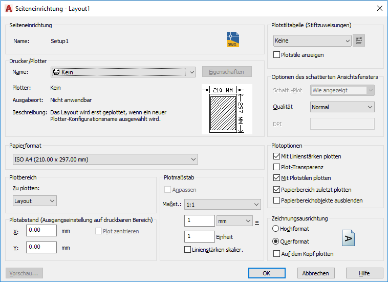 Die von Ihnen angegebenen Seiteneinrichtungseinstellungen werden im Layout gespeichert und können auf andere Layouts angewendet oder in andere Zeichnungen importiert werden.