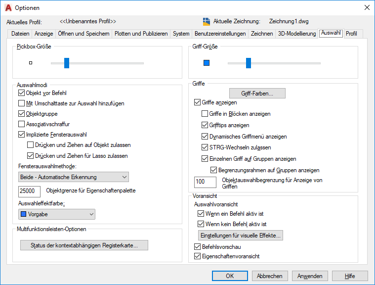 Zeigt die Auswahlvorschau an, wenn keine Befehle aktiv sind. (Systemvariable SELECTIONPREVIEW)