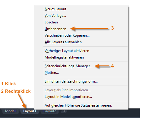 Als Erstes sollten Sie beim Zugriff auf die Registerkarte Layout (1) mit der rechten Maustaste auf die Registerkarte (2) klicken und ihr einen aussagekräftigeren Namen (3) als "Layout 1" geben. Für ein Layout im D-Format bieten sich ARCH D oder ANSI D an.