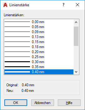 Zeigt die verfügbaren Linienstärken an, die angewandt werden können. Die verfügbaren Linienstärken weisen bestimmte feste Werte auf, die häufig in Zeichnungen auftreten. Um einen Linientyp anzuwenden, wählen Sie den gewünschten Typ.