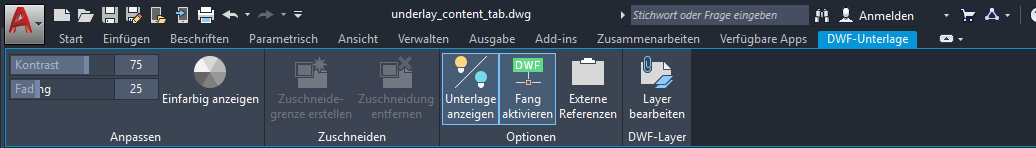 Wenn Sie eine DWF-Unterlage in einer Zeichnung auswählen, wird die Kontextabhängige Registerkarte DWF-Unterlage in der Multifunktionsleiste angezeigt.