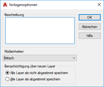 Das Dialogfeld Vorlagenoptionen wird automatisch angezeigt, nachdem Sie als Dateityp *.dwt ausgewählt, den Namen der Vorlagendatei eingegeben und auf Speichern geklickt haben.