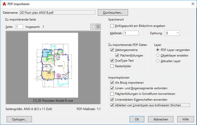 Sie können einen anderen Import-Skalierungsfaktor für die importierten Objekte angeben. Beim Importieren einer Seite aus einer PDF-Datei wird nicht die Einstellung der Systemvariable INSUNITS verwendet, da jede Seite eine unterschiedliche Skalierung haben kann.