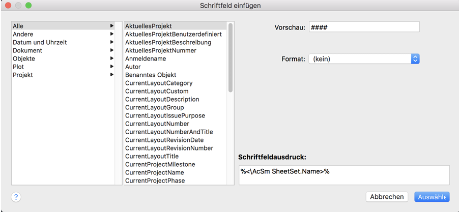 Zeigt den Ausdruck an, der dem Schriftfeld zugrunde liegt. Der Schriftfeldausdruck kann zwar nicht bearbeitet werden, dieser Bereich gibt jedoch Aufschluss darüber, wie Schriftfelder aufgebaut sind.