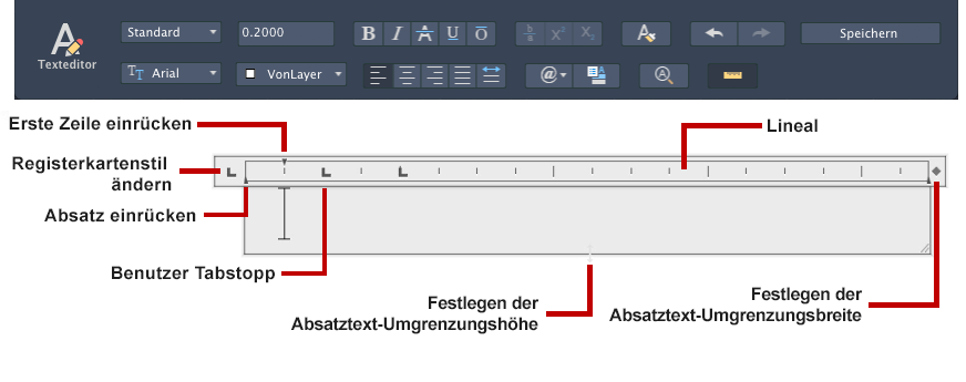 Legt die Ausrichtung des MText-Objekts fest. Sie können auswählen, ob Sie den Text links, mittig oder rechts ausrichten. Sie können den Text oder die ersten und letzten Zeichen des Texts mit den Rändern des Mtext-Felds ausrichten. Weiterhin können Sie jede Zeile des Texts mittig innerhalb der Ränder des Mtext-Felds ausrichten. Leerzeichen am Ende einer Zeile werden in den Text aufgenommen und wirken sich auf die Ausrichtung der Zeile aus. (Nicht für einzeiligen Text verfügbar.)