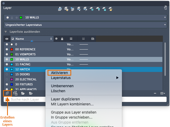 Zum Erstellen eines Layers klicken Sie auf die dargestellte Schaltfläche und geben den Namen des neuen Layers ein. Um den aktuellen Layer zu ändern, doppelklicken Sie auf den Layernamen oder klicken mit der rechten Maustaste auf den Layernamen und wählen Aktivieren.