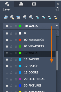 Überprüfen Sie gelegentlich, ob sich die Objekte, die Sie erstellen, auf dem richtigen Layer befinden. Dies wird leicht vergessen, ist aber auch einfach festzulegen. Klicken Sie auf den Dropdown-Pfeil, um eine Liste der Layer anzuzeigen, und klicken Sie dann in der Liste auf einen Layer, um diesen Layer als aktuellen Layer festzulegen. Sie können auch auf ein Symbol in der Liste klicken, um die betreffende Einstellung zu ändern.