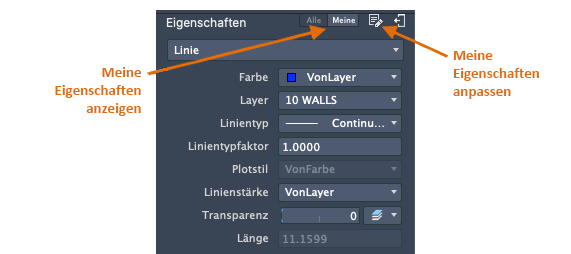 Sie können die Eigenschaftsprüfung so einstellen, dass alle Eigenschaften für die ausgewählten Objekte angezeigt werden oder eine personalisierte Liste der Eigenschaften angezeigt wird. Richten Sie Ihre personalisierte Eigenschaftenliste über die Schaltfläche Eigenschaften anpassen ein.