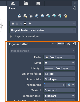 Sie können Eigenschaften wie Farbe und Linientyp einzelnen Objekten oder als den Layern zugewiesene Vorgabeeigenschaften zuweisen.
