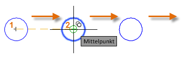 Verwenden Sie dann den Objektfangmodus Zentrum, klicken Sie auf den Mittelpunkt von Kreis 1, dann auf den Mittelpunkt von Kreis 2 usw.