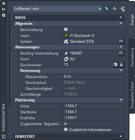Ändern Sie die grundlegenden Eigenschaften eines Luftkanals/-rohrs mithilfe der Eigenschaftenpalette.