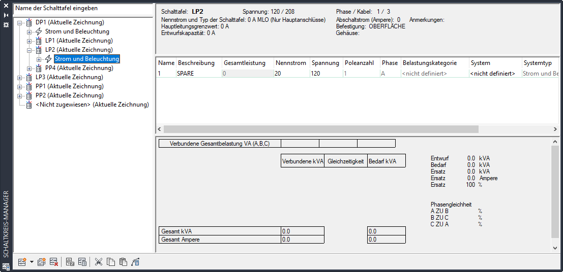 2. Erweitern Sie im Schaltkreis-Manager die Schalttafel und wählen Sie den Systemtyp (z. B. Strom und Beleuchtung), um die Schaltkreiseigenschaften anzuzeigen.
