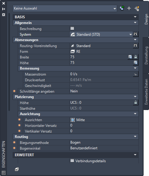 | Routing-Voreinstellung | Wählt eine Routing-Voreinstellung für das Luftkanal/-rohr-Objekt in der aktuellen Zeichnung aus | Standard (Standardeinstellung); Optionen aus dem Katalog |