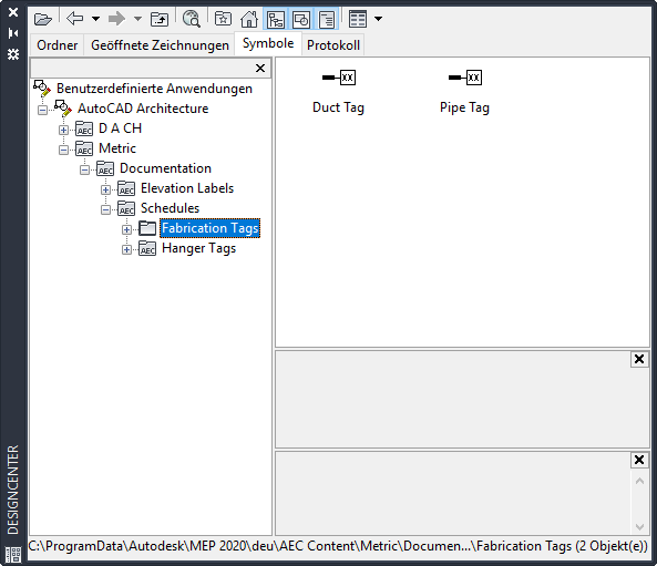 Anmerkung: Die Designsymbole in DesignCenter sind AutoCAD®-Multi-View-Blöcke (MV-Blöcke). Sie können nicht mit AutoCAD MEP toolset-Objekten verbunden werden. Sie dienen nur als Beschriftungen zur Zeichnung.